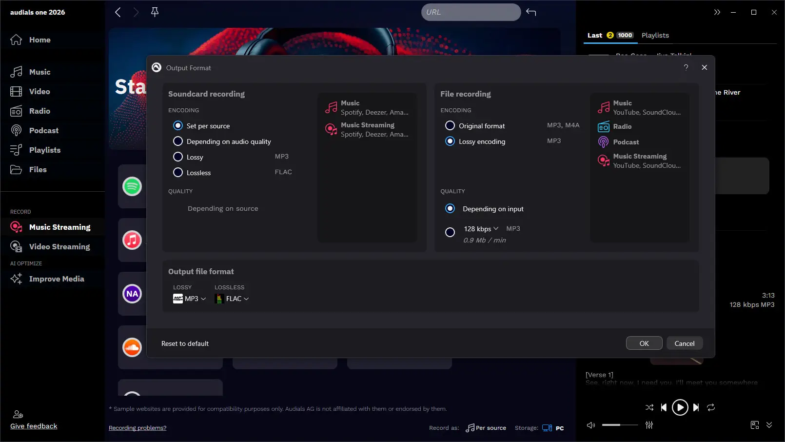 Audialsは各録音に最適なストリーミング品質とファイル形式を自動で判別します。希望に応じて、すべての曲をMP3、FLAC、AAC、M4A、AIFFなど、同じフォーマットで保存することもできます。