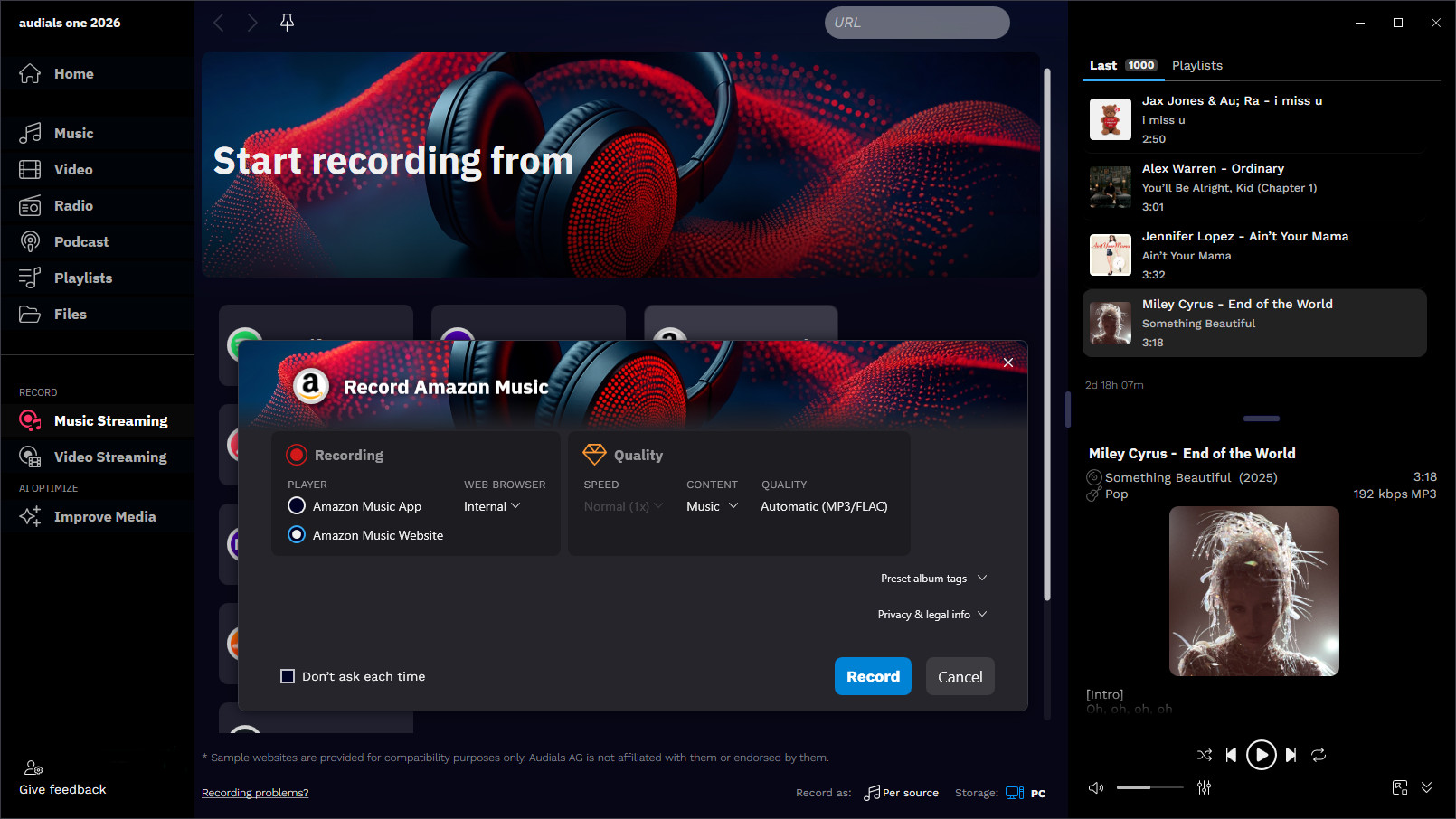 Audials Oneを使えば、アルバム、オーディオブック、プレイリスト、単曲まで、すべての音楽ストリーミングサービスから、直接Windows PCに録音できます。録音は全て自動で個別の音声ファイルとして保存され、広告は自動で除去されます。
